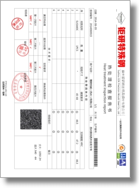 鉅研特殊鋼的熱處理工廠通過了ISO9000質量認證,并提供嚴謹的《熱處理品質檢查報告書》,便于品質追溯。
